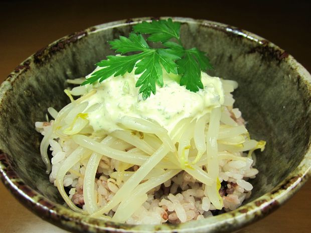 朝ご飯〜ヘルシーモヤシのタルタルもどき丼〜v(^0^)/