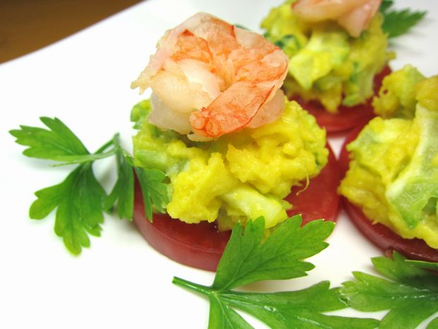 トマトにのっけてボイルしたエビをトッピング〜