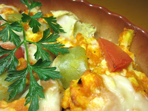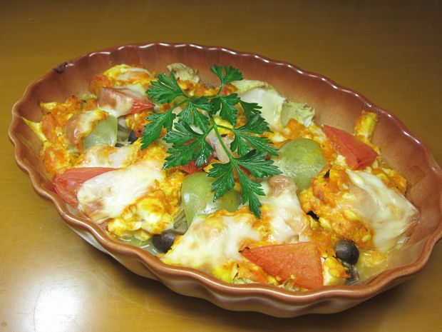 青、赤トマトと、キノコや白菜のお豆腐とカボチャのグラタンらしきぃ〜〜