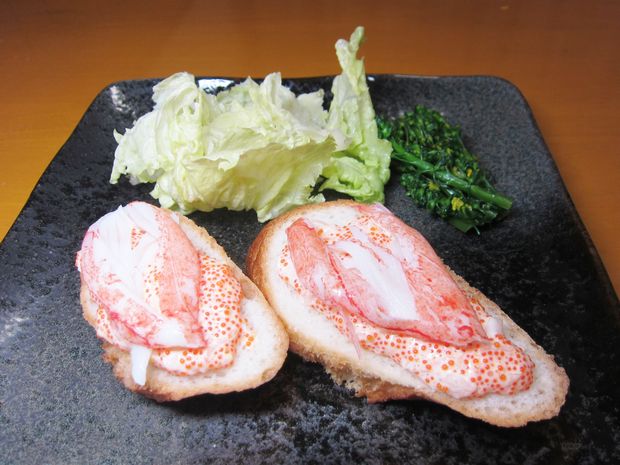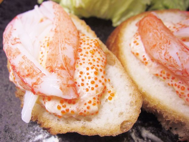 朝ごパン〜簡単海鮮カニカマと飛び子のバケット〜v(^0^)/