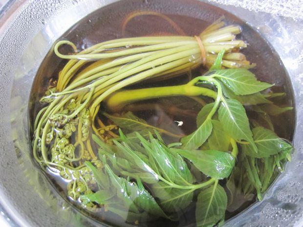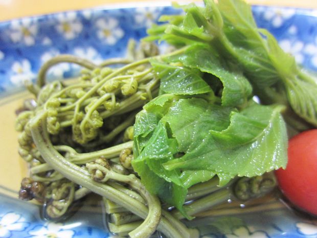 アク抜きしたワラビとさっと茹でたタラの芽のおひたし。