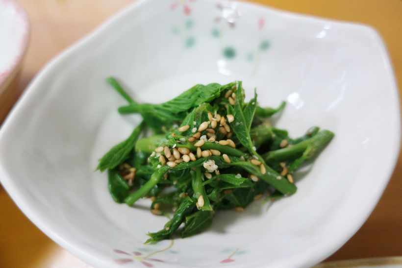 アク抜きしたイタドリにおろしショウガとお醤油とカツオブシを混ぜ込んでしばらくなじませたものですよ。