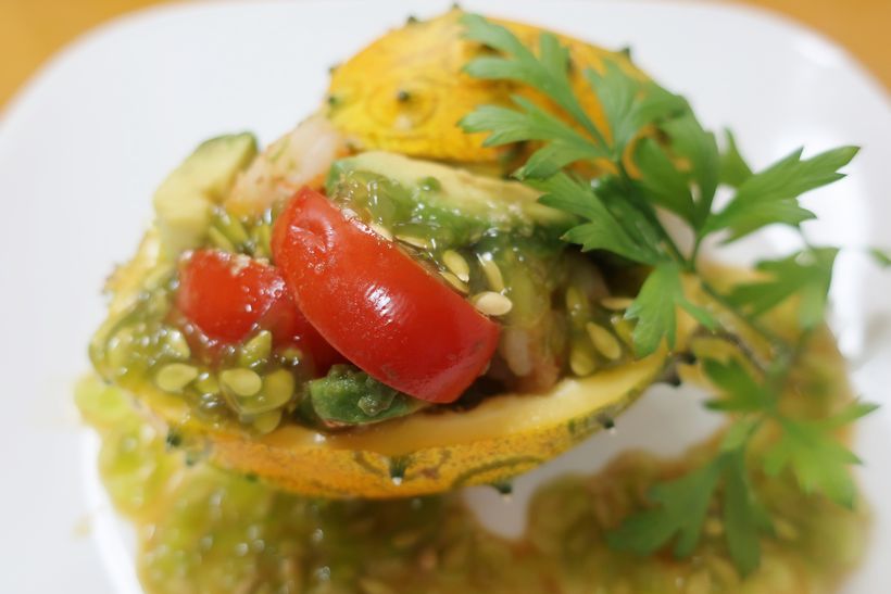 稲荷アゲにアボカドとタマネギをみじん切りにしてレモン汁とタバスコを混ぜた物を詰め込んだの。
